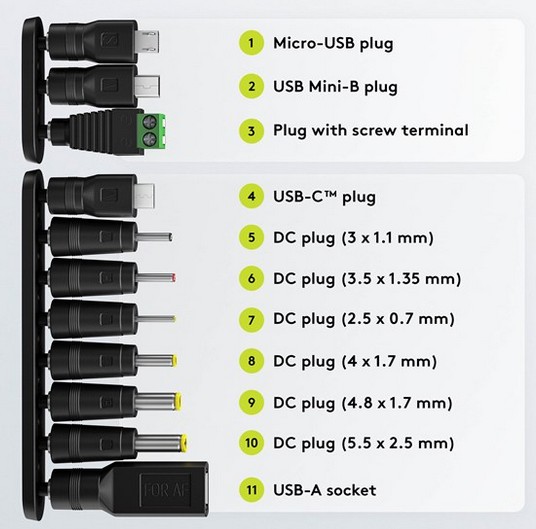 uklj. 11 adaptera: 7 DC adaptera plus USB-C, USB-A, USB Mini-B, Micro-USB i vijčani priključak