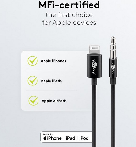 Audio kabel s Lightning utikačem kompatibilan je sa svim Apple uređajima s Lightning priključkom (Apple MFi certifikat).