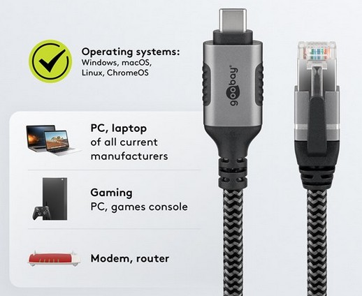 LAN kabel omogućuje stabilnu, žičanu internetsku vezu s USB-C™ uređajima bez vlastitog mrežnog priključka.